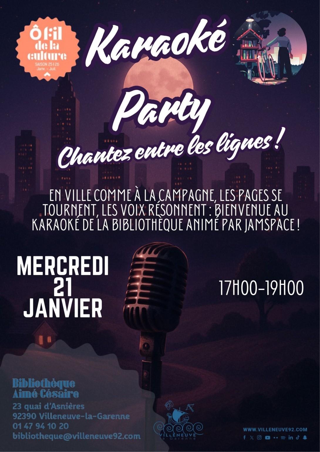 Dans le cadre des Nuits de la lecture, la bibliothèque vous invite à un évènement festif et décalé : un karaoké unique où le son des villes et le son des champs se rencontrent. Entre refrains populaires et classiques intemporels, venez partager un moment convivial où la lecture laisse place au chant, à l’improvisation et au plaisir d’être ensemble.
