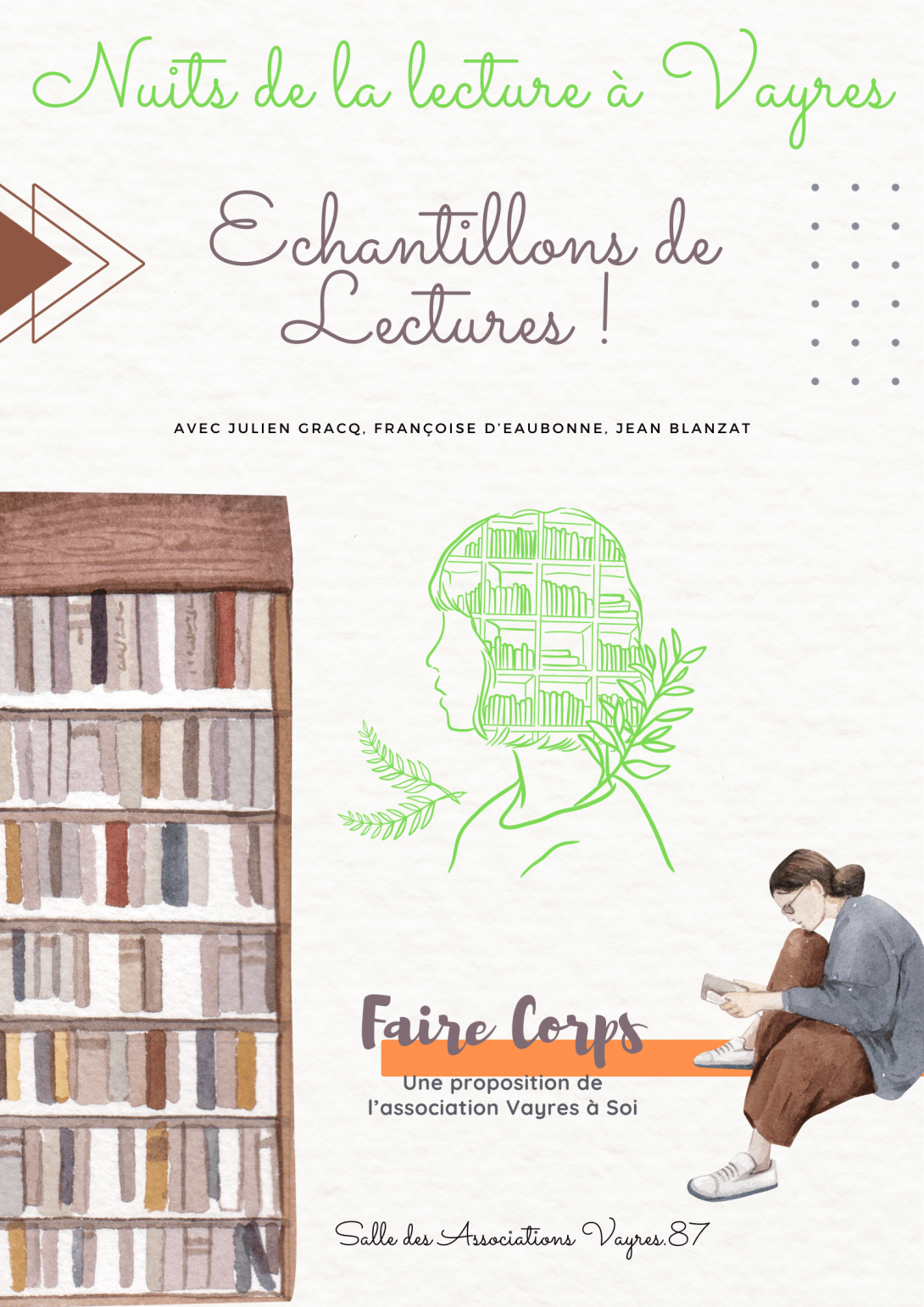 L'association Vayres à Soi vous invite à faire corps avec une sélection de textes littéraires. Une petite série de lectures en épisodes vous sera présentée afin de découvrir le corps dans tous ses états réels et imaginaires. En extraits, on entre par les portes de Julien Gracq et du récit "La Maison" pour nous offrir un parcours sensuel et intériorisé, on passe par Les Eaux étroites et son voyage sans retour sur l'itinérance des corps, nous aborderons l'enfermement de l'exil intérieur grâce à Françoise D'Eaubonne et son œuvre "Les écrivains en cage", et enfin, Jean Blanzat et son Faussaire pour une nuit d'hiver dans un cimetière de la Gartempe...Vayres, bourg et constellations de villages, ne dispose pas d'une bibliothèque, cependant, la lecture publique reste la première marche d'accès à la culture. Cette proposition, première participation à cet évènement, est une déclaration d'amour à la lecture!