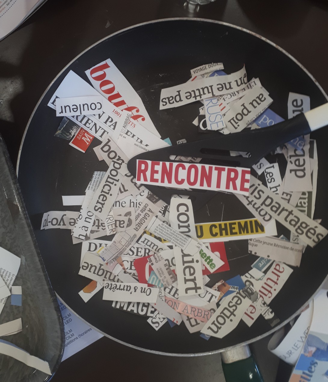 Venez nous retrouver pour cuisiner les mots en faisant votre marché dans les journaux et magazines, en les libérant par des rencontres verbales inédites, en les laissant mijoter suffisamment pour les déguster. On jouera, cherchera, rêvera à coup de ciseaux, de colle et de bricole, pour qu'ainsi des titres de magazines deviennent poème, fait divers loufoque ou cocktail d’expression !