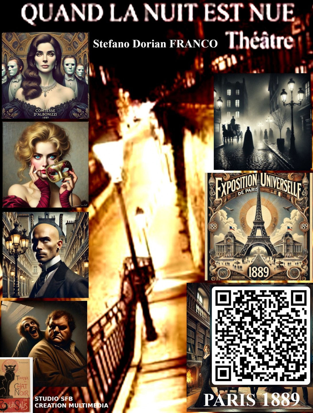 L’univers mystérieux du Paris de 1889 renaît à travers la pièce de théâtre "Quand la nuit est nue", écrite par l’auteur et créateur multidisciplinaire franco-italien Stefano Dorian Franco. Une fresque historique en trois actes, au cœur de l’Exposition universelle et du dévoilement de la tour Eiffel. La pièce plonge dans un Paris secret, entre ateliers de Montparnasse, Montmartre sulfureux du chat noir, et salons aristocratiques de Passy, là où se croisent artistes, esprits et intrigues. Quatre personnages partent à la recherche d’un tableau volé la nuit précédant son exposition, au milieu des ombres de Maupassant, Toulouse-Lautrec, Oscar Wilde, Dorian Gray et de la comtesse de Castiglione. Dans les brumes d’absinthe et les débuts du cinématographe, l’enquête devient réflexion et thriller métaphysique sur la création et l’identité. Présentée en Live également sous forme d’exposition immersive et projection en réalité virtuelle V/R, la pièce s’inscrit dans l’Extended Universe Paris 1889 Belle Époque, où le Paris d’alors est reconstitué par pilotage de l' intelligence artificielle.